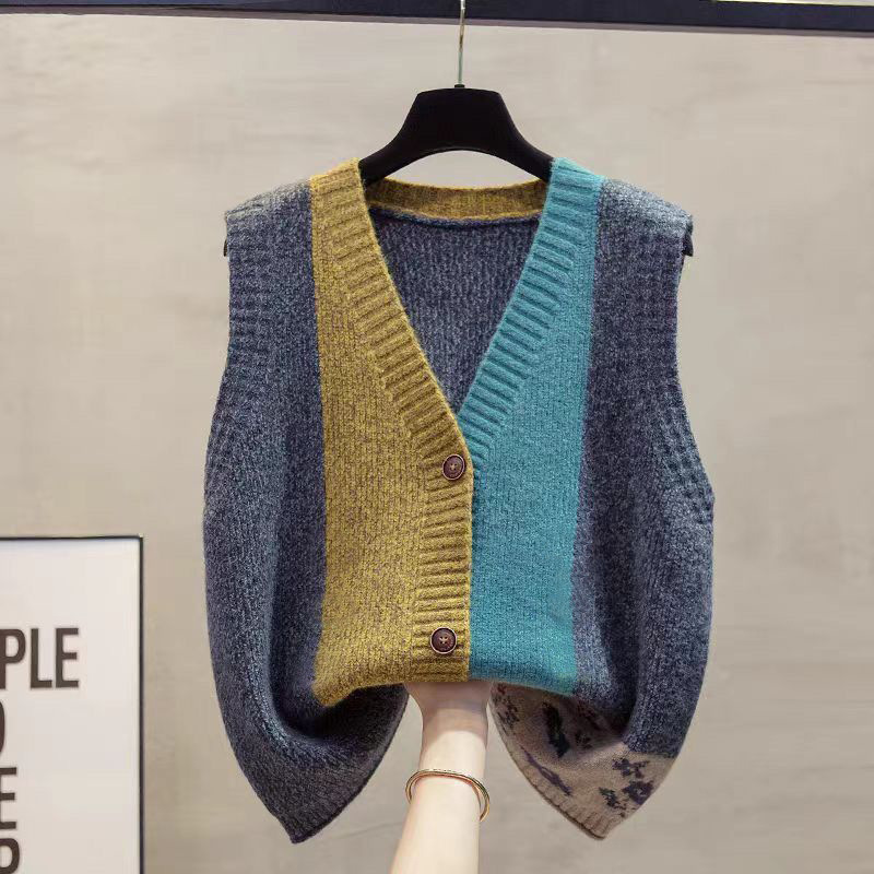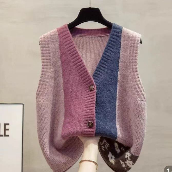 秋冬新款 拼色V領針織衫 馬甲背心 寬鬆簡約 外穿開衫 坎肩毛衣